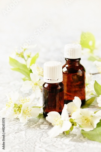 Oil of jasmine. Aromatherapy with jasmine oil. Jasmine flowers