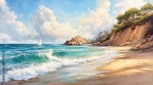 Oil painting capturing the essence of summer holidays with a stunning beach landscape and scenic coastal views featuring a picturesque shoreline and natural beauty