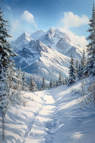 Oil painting depicting a snowy mountain landscape with a hiking trail showcasing the beauty of winter scenery