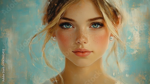 portrait, woman, girl, face, eye, blue eye, blond, hair, lip, freckle, painting, oil, canvas, art, beauty, delicate, feminine, soft, elegant, closeup, head shot, beautiful, attractive, model, studio, expression, mood, gentle, dreamy