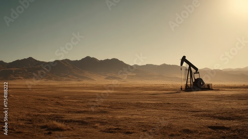 oil, pump, drilling, desert, landscape, mountain, energy, resource, extraction, arid, dry, earth, brown, silhouette, sky, sunlight, dust, wind, exterior, outdoors, geography, environment, industrial, machinery, equipment, resourceful, production, natural, rugged, wide, horizontal, copy space, isolated, nature, exploration