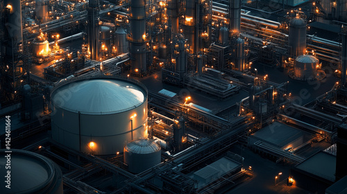 Oil Refinery and Chemical Factory Banner: Crude Tank and Gasoline Supply at Twilight Night Time
