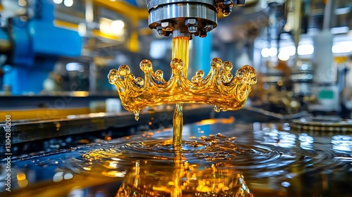 oil, refinery, industry, fluid, dynamic, liquid, crown, gold, yellow, metallic, machine, technology, engineering, manufacturing, production, process, energy, crude oil, chemical, factory, plant, texture, background, abstract, splash, droplet, flow, stream, shiny, glossy, detail, macro, closeup, pattern