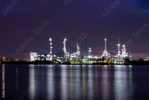 Oil refinery plant chemical factory and power plant with many storage tanks and pipelines at sunset.