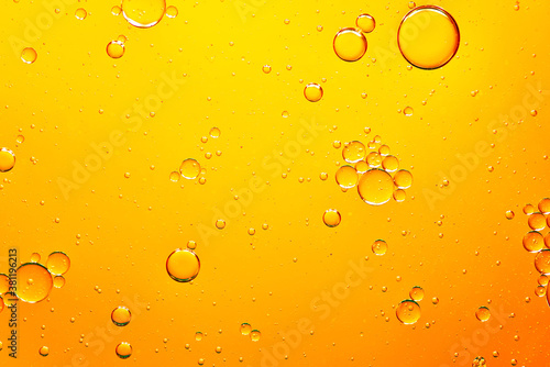 oil with bubbles on coral background. Orange Abstract space background. Soft selective focus. macro of oil drops on water surface. copy space. air bubbles in water