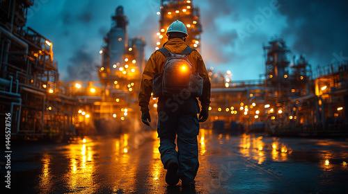 oil, refinery, men at work, industrial, energy, night, safety, plant, crude oil, industry, fuel, gas, power, chemical, manufacturing, engineering, petrochemical, twilight, backpack, helmet, work, occupation, blue, orange, light, dark, dusk, evening, man, person, walking, inspection, operation, production, extraction, processing, resource, factory, site, illuminated, background, blur, light, wet, danger, hazard, career
