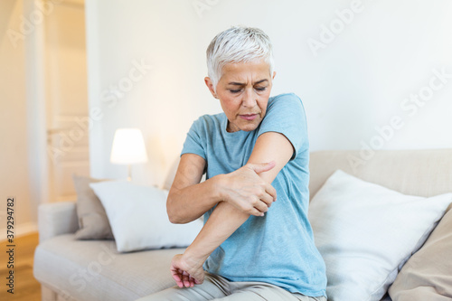 Old age, health problem and people concept - close up of senior woman suffering from pain in hand at home. woman hand holding her elbow suffering from elbow pain.