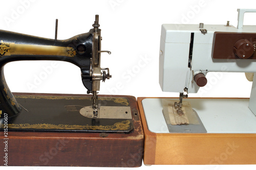 old and new sewing machines, stand against each other. mechanical vs electrical, vintage vs modern, concepts. isolated on white background, with clipping path