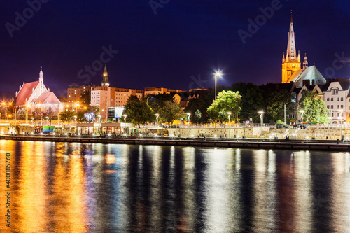 no people, horizontal, outdoors, night, illuminated, building exterior, city, city landscape, waterfront, river, christianity, church, church, long exposure, poland, szczecin