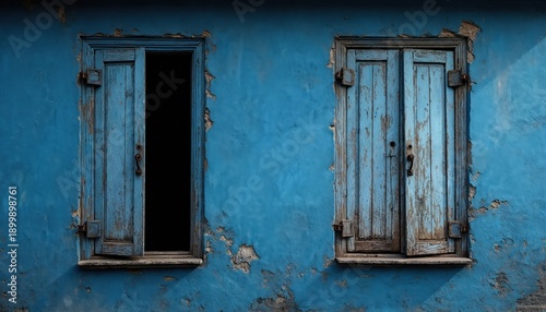 Old blue window shutters on textured wall. Peeling paint, weathered wood, rustic house exterior detail. Light and shadow create depth, rural scene.