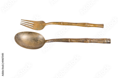 spoon, fork, old, brass, vintage, retro, collection, aged, tool, utensil, equipment, food, metal, grunge, wooden, table, background