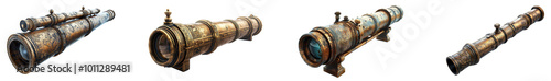 Old brass telescopes. Set png isolated on transparent background
