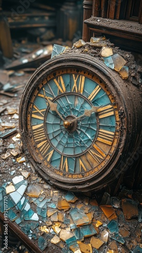 Old, broken clock with Roman numerals lies amidst shattered, colorful glass pieces, creating a scene of neglected decay and history