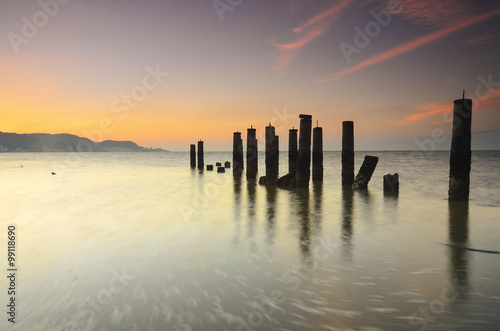 Old broken pier during awesoome beatiful sunset. Vibrant colour