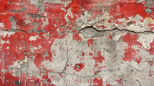Old cement wall concept with peeling red paint, cracks and copy space.