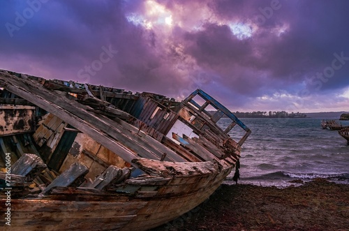 boat, ship, sea, wreck, shipwreck, old, water, abandoned, beach, sky, coast, ocean, rust-eaten, broken, vessel, nautical, shore, wooden