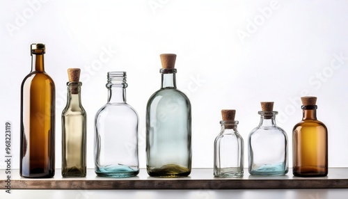 old empty glass apothecary bottles isolated against a white studio background with copy space. antique glassware used as decorative art piece. Transparent vintage containers to recycle or repurpose