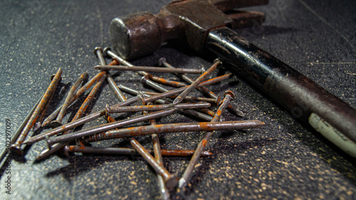 old hammer with old and rusty nails
