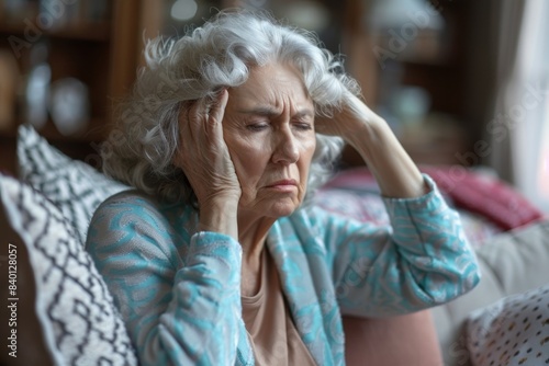 senior, woman, sitting, couch, hand, cephalalgia, stress, expression, indoor, comfortable, mature, retirement, relaxation, fatigue, anxiety, sorrowful, loneliness, depression, discomfort, serious, worried, elderly, distress, home, upset, sleepy, unhappy, furniture, sofa, domestic, mood, pensive, worn-out, frown, senior citizen, emotional, retired, senescence, living room, aged, thoughtful, sad, unwell, matured, senile, solitude