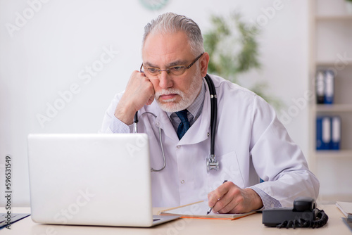 old, doctor, working, clinic, hospital, medicine, health, health care, care, remote, computer, laptop, online, cyberspace, writing, taking, note, thinking, concerned, worried, surgeon, medicals, physician, practitioner, recovery, recovering, insurance, healer, consultation, man, discussing, explaining, treatment, specialist, check-up, healthy, work, occupation, practice, clinical, job, examining, check-up, diagnosis, diagnostic, prescription