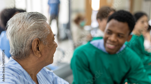 Old man patient talking with a young African doctor waiting to get health medical check up at a clinic lobby