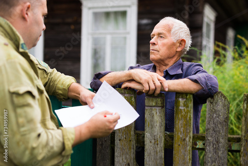 Old man talking with employer of public utilities outdoors