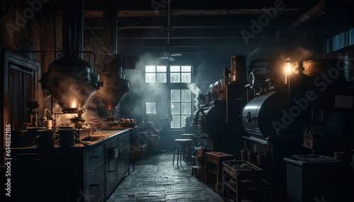Old metal workshop with antique machinery and dirty steel equipment generated by AI