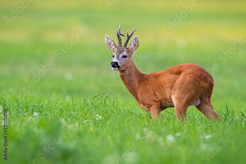 Old roe deer, capreolus capreolus, buck with dark antlers looking aside in summer nature. Curious wild mammal in rutting season standing on a meadow with green grass and wildflowers.