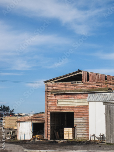 sawmill, building, industry, construction, sky, abandoned, dangerous, roof, wood, old, broken, poor, yard, blue, town, rural, structure, history, employment, local