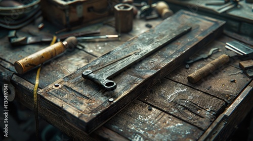 tool, workshop, workbench, vintage, rust-eaten, metal, wood, old, antique, craft, repair, industry, equipment, hand, work, table, surface, grunge, texture, background, craftsmanship, detail, design, object, iron, steel, hammer, saw, blade, machinery, mechanic, manufacturing, construction, hardware, technology, occupation, history, aged, worn, dirty, dark, shadow