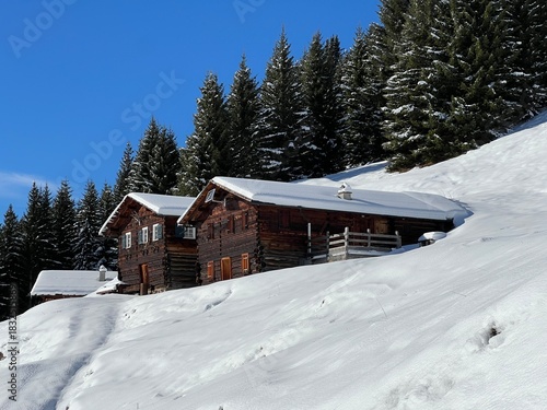 Old traditional swiss rural architecture and alpine livestock farms in the winter ambience of the alpine Swiss village St. Antönien - Canton of Grisons, Switzerland (Kanton Graubünden, Schweiz)