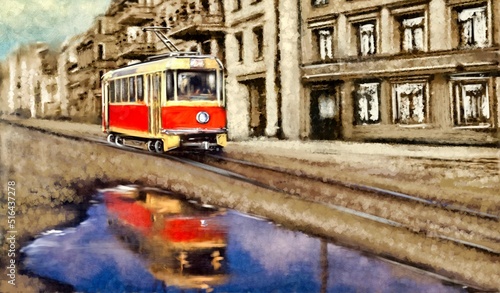 Old tram in the old city. Oil paintings landscape, fine art