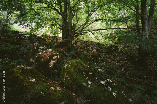 Old tree in green forest with moss
