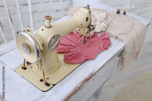 sewing, machine, sew, needle, equipment, tool, sewing machine, textile, clothing, thread, work, white, industry, tailor, metal, craft, isolated, fashion, woman, fabric, electric, object, hand, old, medicals, vintage, beige, red, little, dress, girl, doll, atelier, brick, wall