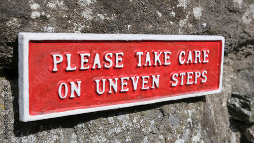 Old vintage bright red sign with white text on stone wall, please take care on uneven steps
