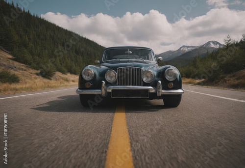 old vintage car on road travel , realistic illustration