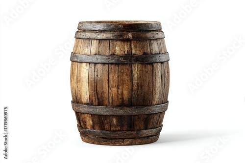 Old Wooden Barrel with Metal Bands on White Background