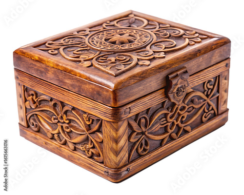 Old wooden box with an antique carved wood pattern isolated on white background PNG .AI Generated.