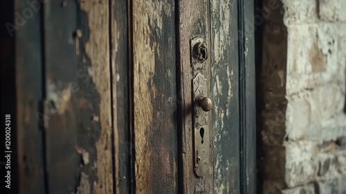 door, wood, old, antique, knob, keyhole, handle, aged, worn, weathered, rustic, vintage, metal, brass, brown, grey, dark, texture, detail, background, surface, pattern, grain, fractured, damage, decay, history, time, past, building, architecture, house, home, interior, exterior, closeup, macro, photograph, image, object, element, design