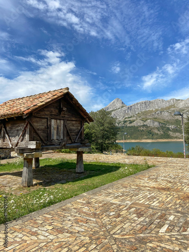mountain peak, cantabria, reservoir, built structure, summer, country, culture, farming, antique, granary, hangar, house, cabin, door, exterior, spanish, bungalow, structure, home, wooden, construction, traditional, spain, old, building, countryside, village, farm, scenery, wood, rural, architecture, tour tourism, travel, nature, landscape