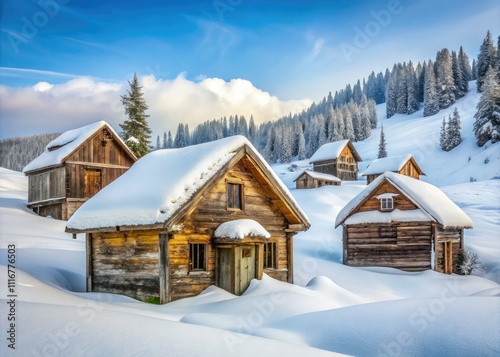 Old wooden houses dotting Goderdzi Ski Resort in Adjara, Georgia, embody a surreal winter abandonment, bathed in ethereal light, evoking dreams of forgotten places.