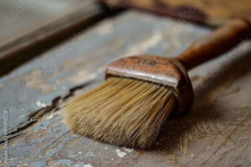 Old wooden paint brush with natural bristles lying on a weathered wooden surface, showing signs of age and use