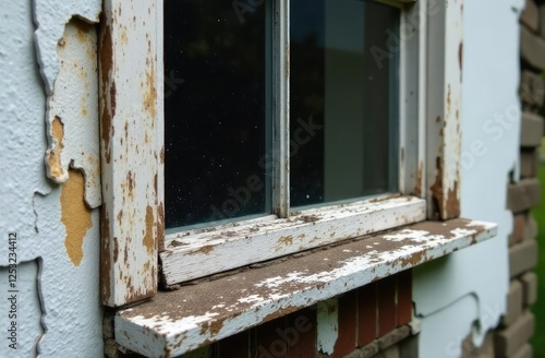 Old wooden window frames with rotting wood and cracked peeling paint, house needs renovation and new frames closeup