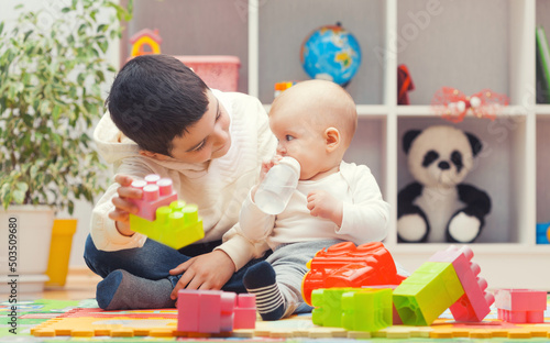 older brother plays with sister with colourful building blocks at home or kindergarten