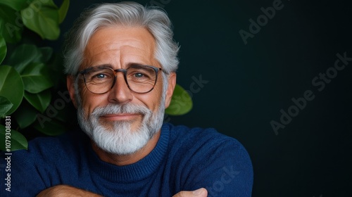 older gentleman with a neatly trimmed gray beard and hair smiles warmly while seated against a rich dark green backdrop. Lush green leaves frame his figure, adding tranquility to the moment