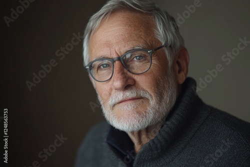 Older man with glasses, gray hair, and beard looking thoughtfully at the camera in a softly lit room