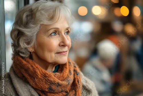 woman, senior, elderly, mature, lady, female, window, cafes, eatery, thinking, pensive, thoughtful, gazing, looking, foulard, shawl, winter, autumn, fall, indoor, indoor, inside, profile, portrait, face, head, shoulder, caucasian, beautiful, beauty, elegant, serene, peaceful, calm, quiet, relaxed, content, contentment, happiness, cheerful, ageing, age, wisdom, life events, lifestyle