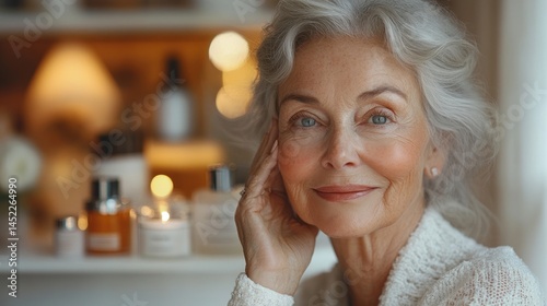 woman, older, grey hair, smiling, indoor, beauty product, skincare, cosmetic, portrait, face, happy, ageing, wellness, lifestyle, mature, female, person, light, soft, blurred background, candle, bottle, beauty, serene, calm, peaceful, elegant, graceful, healthy, natural, skin, care, well-being, positive