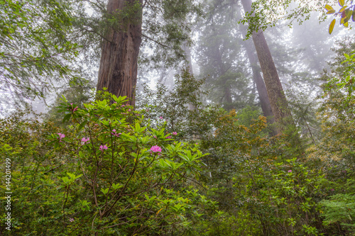 Old-growth sequoias and amazing pink flowers rhododendron in the fairy green forest. Redwood national and state parks. California, USA
