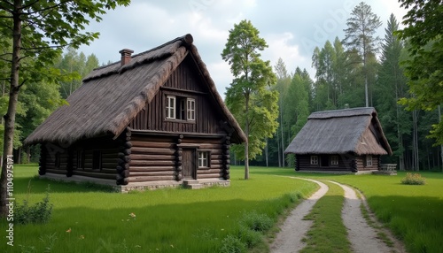 Old-world charm cabin in a serene forest setting Peaceful log cabin nestled among tow